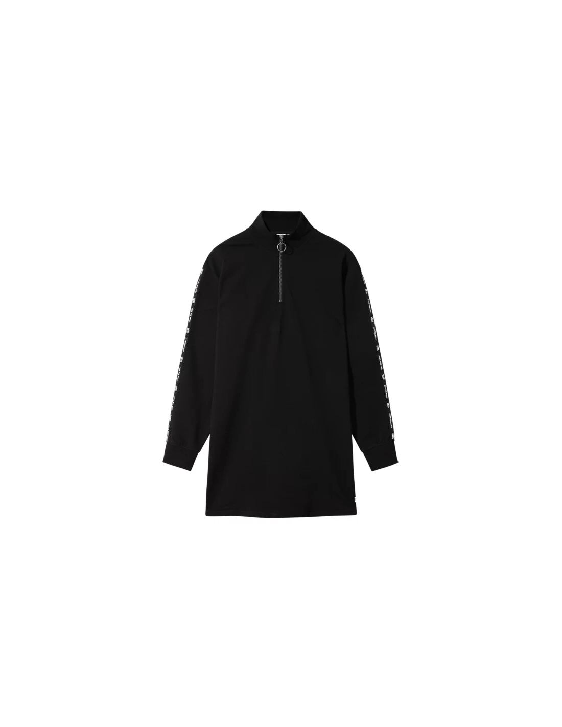 The Chromoed Mock Dress is an 80% cotton, 16% polyester, and 4% elastane stretch French terry dress with long sleeves, a quarter-zip mock neck, and mini logo taping at the sleeves. Model is 178 cm tall and wearing a size Small.