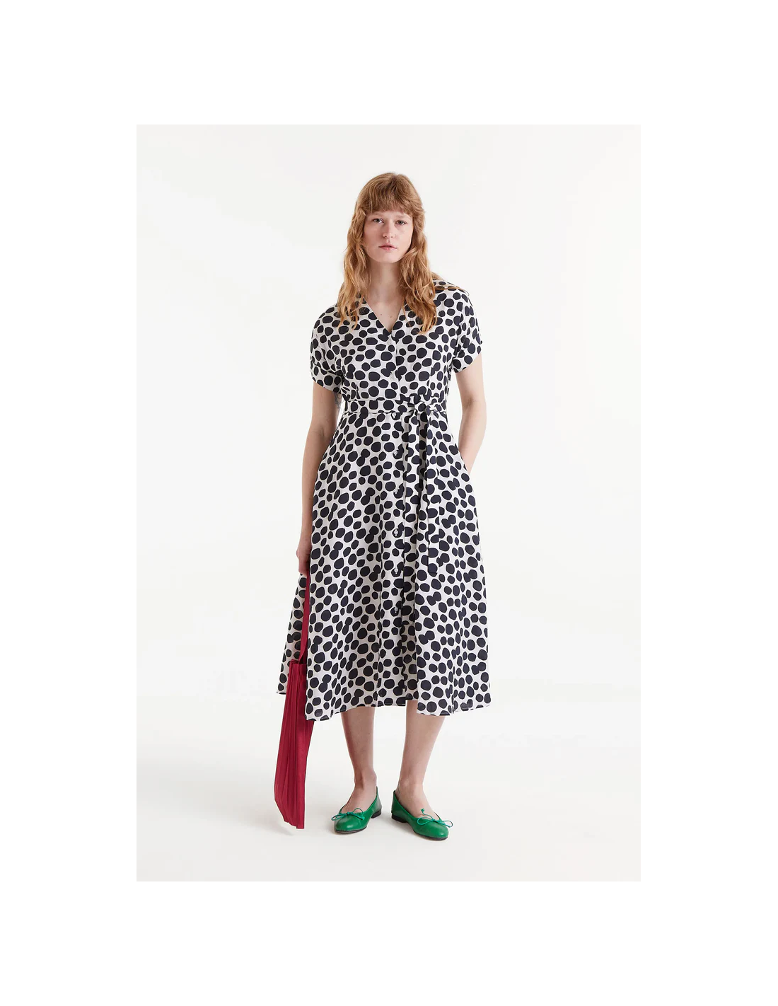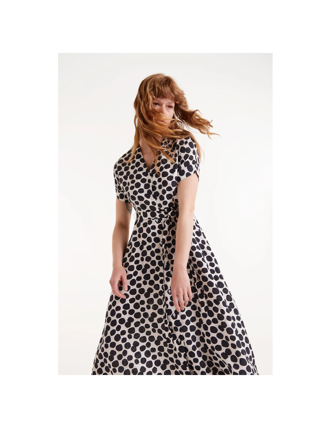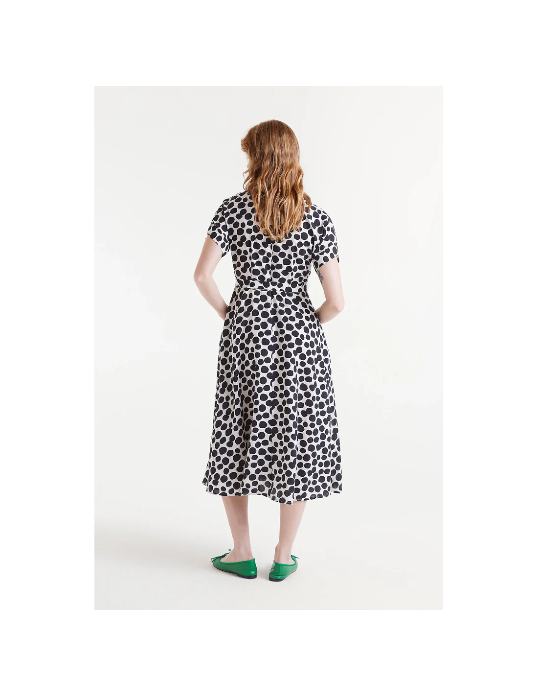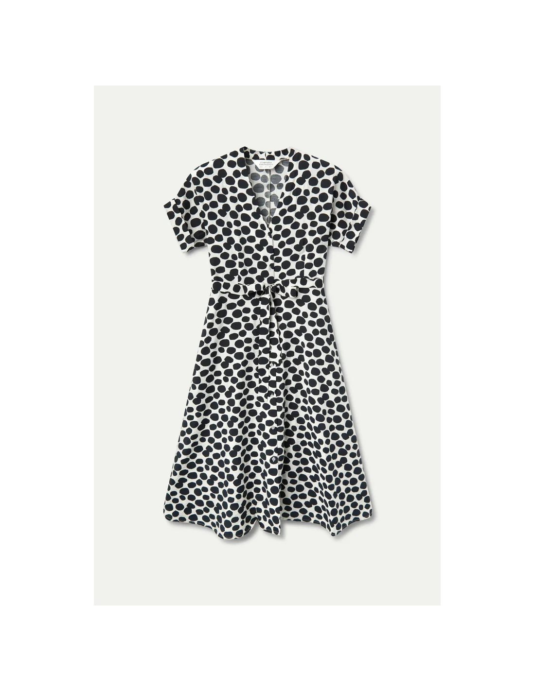 Μίντι πουκάμισο φόρεμα σε ελαφρύ κρεπ με στάμπα Terrazzo πουά. Με γιακά πέτο και κοντό φουσκωτό μανίκι. Κλείσιμο μπροστά με κουμπιά και ζώνη.