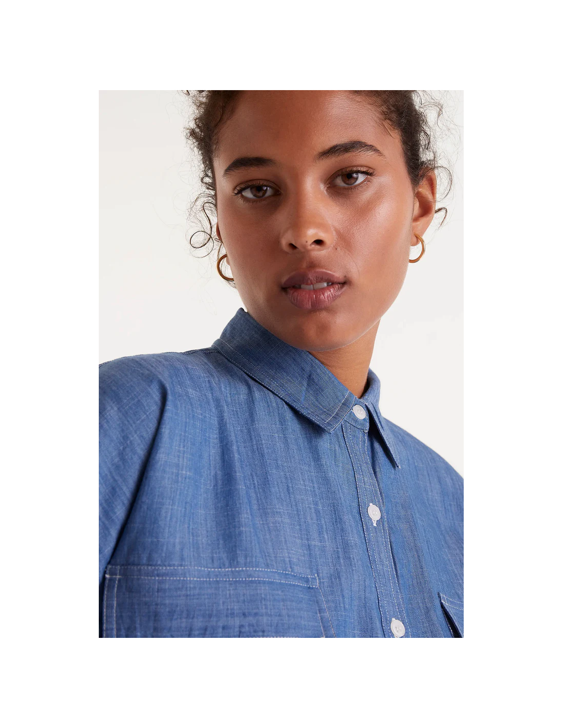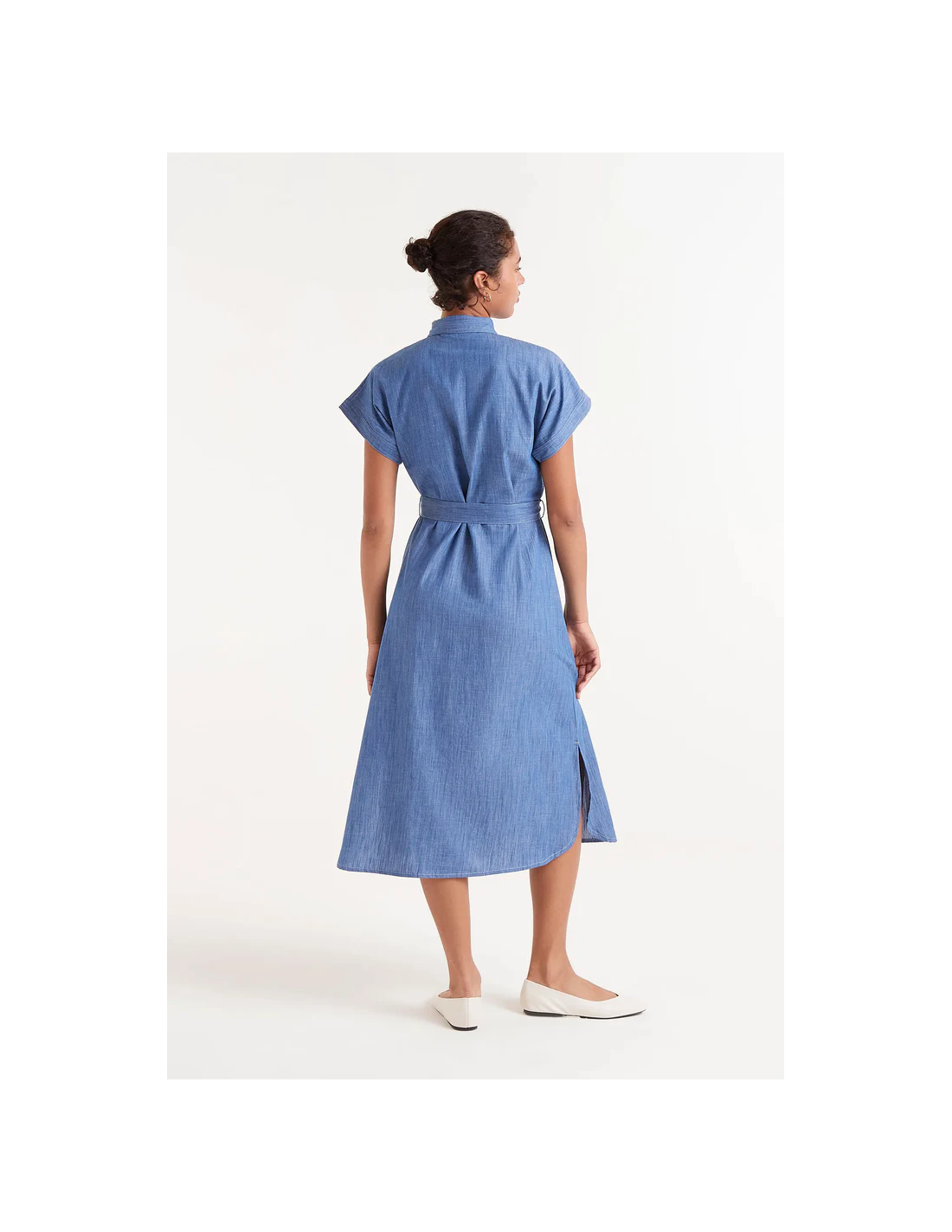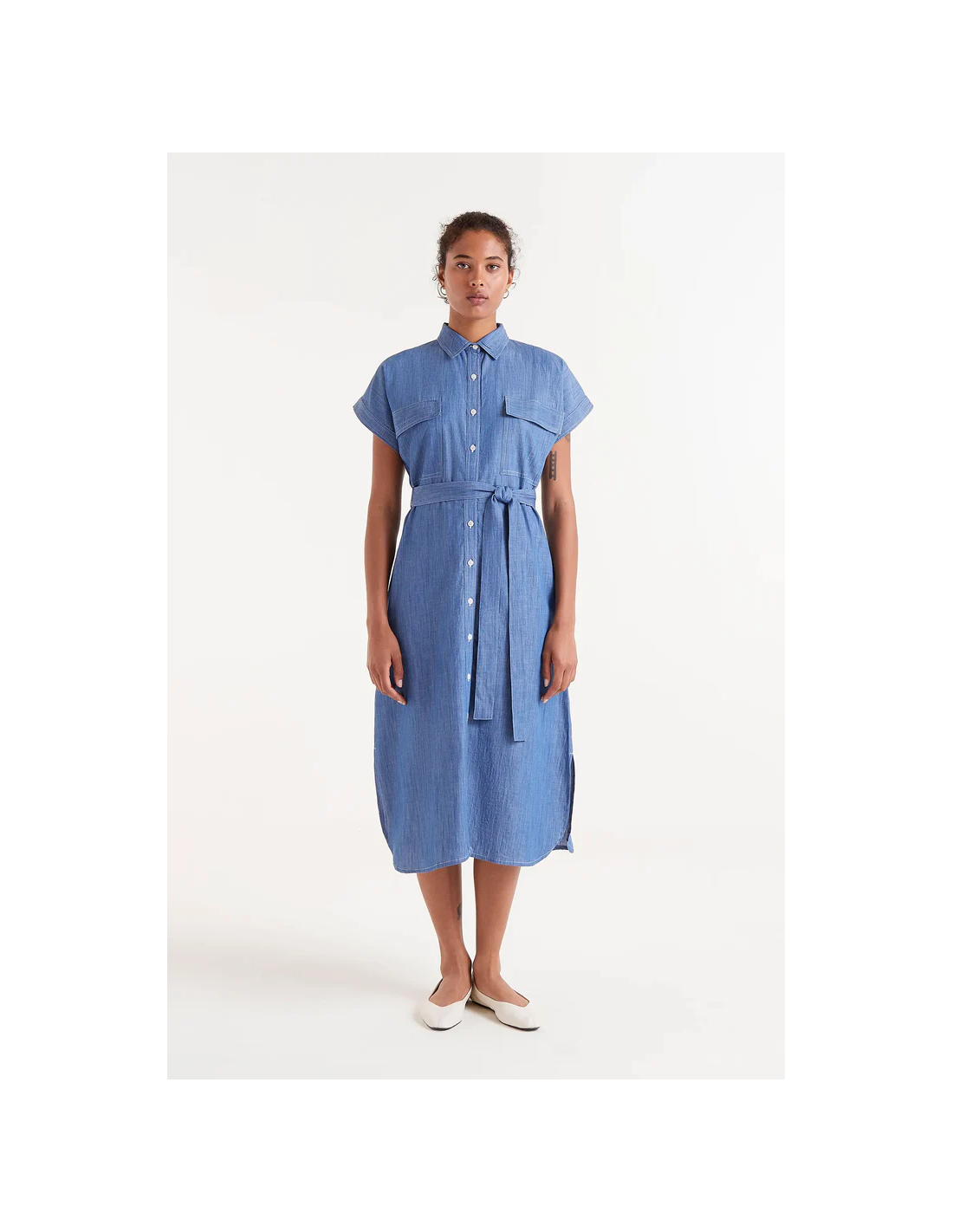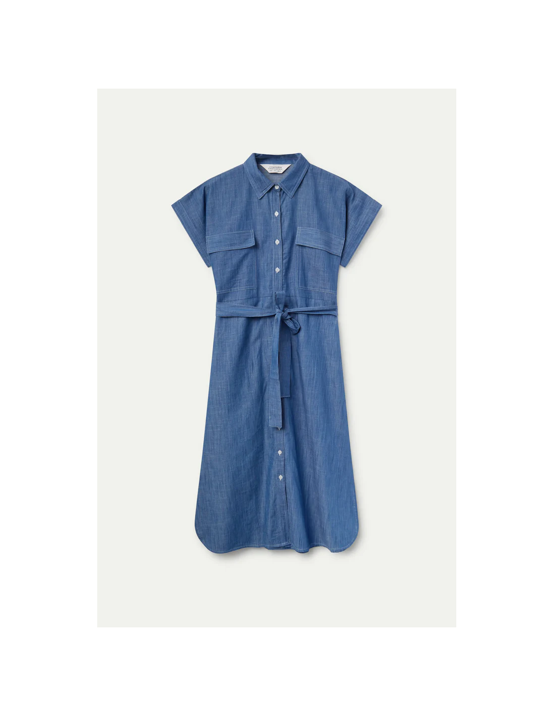 Μίντι πουκάμισο φόρεμα σε γαλάζιο τζιν ύφασμα. Με γιακά πέτο και κοντό μανίκι. Μπροστινό κουμπί και κλείσιμο με ζώνη. Μπροστινές patch τσέπες. Λεπτομέρεια με σχισμή στο πλάι.