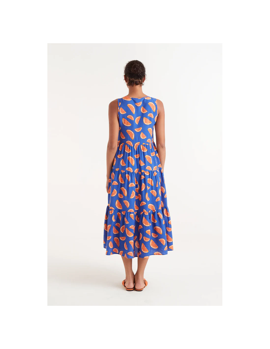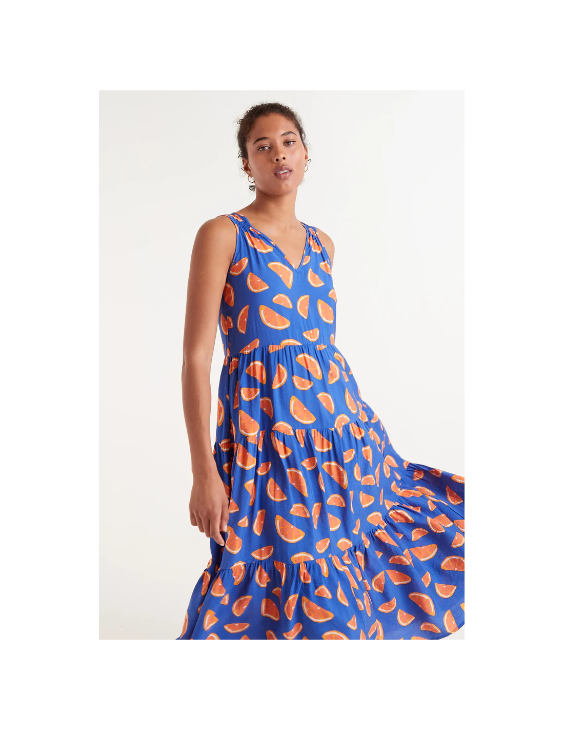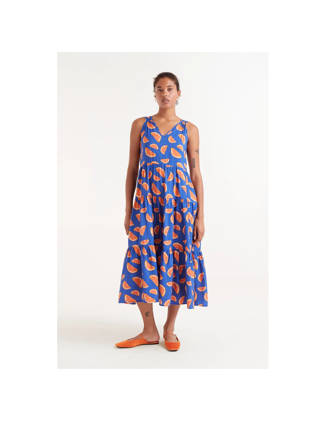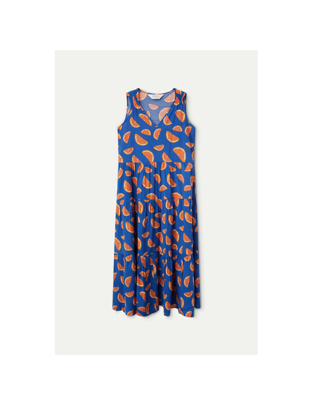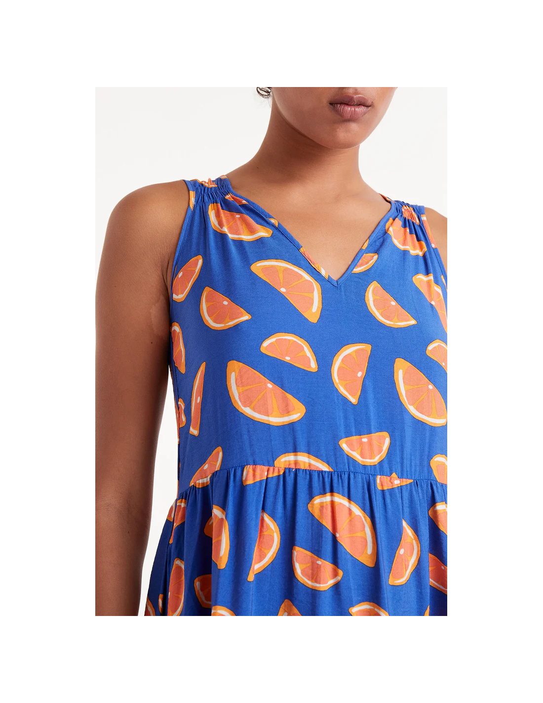 Μίντι φόρεμα που ρέει σε ελαφρύ κρεπ με στάμπα γκρέιπφρουτ. Με αμάνικη λαιμόκοψη σε V. Μοντέλο προσαρμοσμένο στη μέση με οριζόντια λεπτομέρεια.