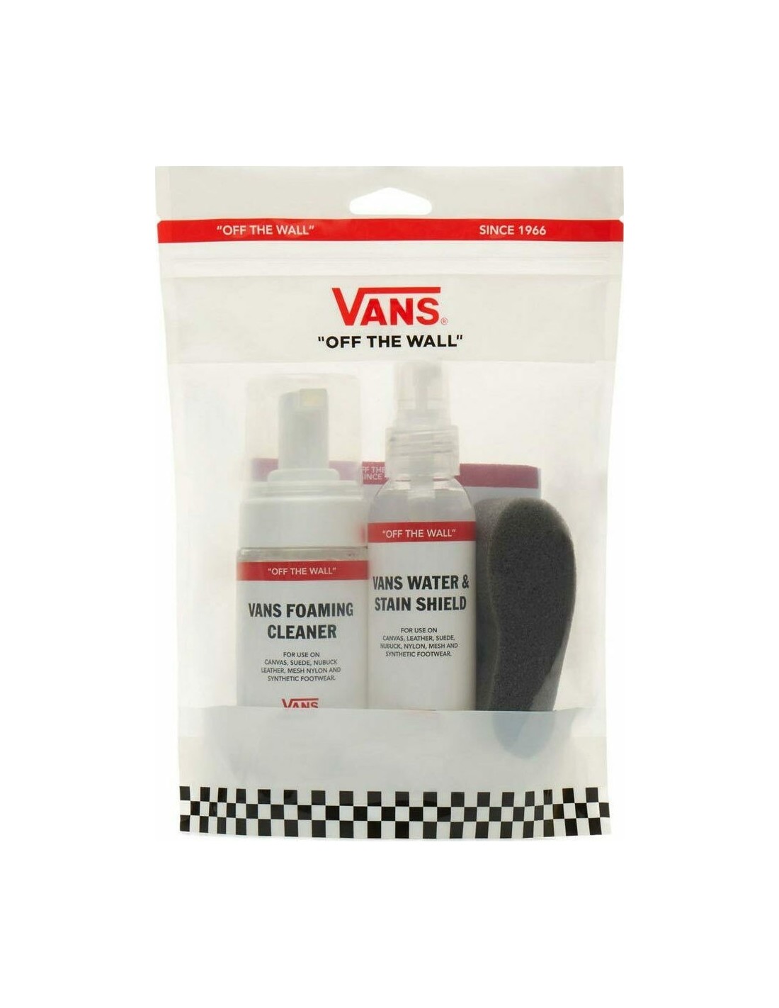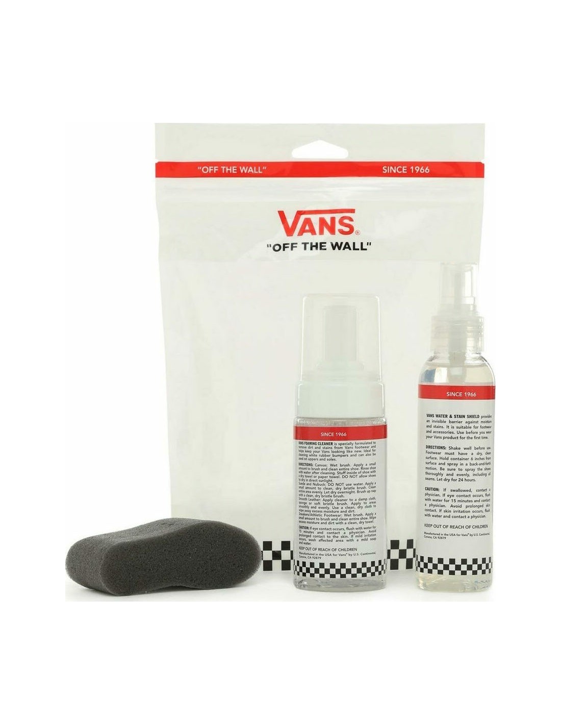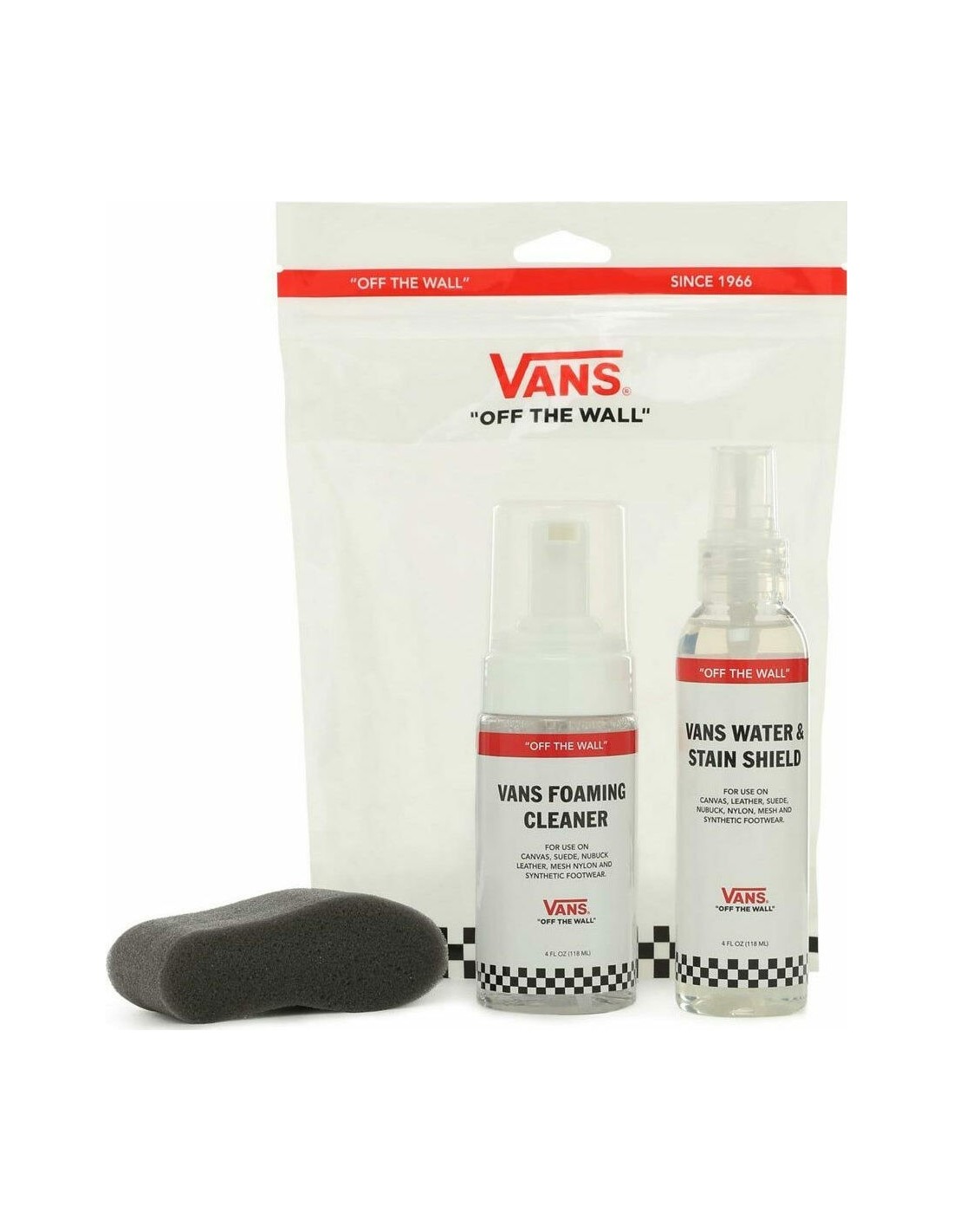 The Vans Shoe Care Canvas Kit features three Vans shoe care essentials in a resealable bag: the Water & Stain Shield, Foaming Cleaner, and a Vans shoe-shaped Shoe Sponge. The Vans Water & Stain Shield (118 ml) is specially formulated to provide an invisible barrier against moisture and stains, and is ideal for leather, suede, nubuck, cotton, canvas, and nylon footwear and accessories. The Vans Foaming Cleaner (118 ml) is specially formulated to remove dirt and stains from Vans footwear, keeping your Vans looking like new. It is ideal for cleaning white rubber bumpers and can also be used on uppers and soles. The Vans Shoe Sponge is a safe and effective way to remove stains and dirt. Used with the Foaming Cleaner, it is ideal for cleaning white rubber bumpers and can be used on uppers and soles.