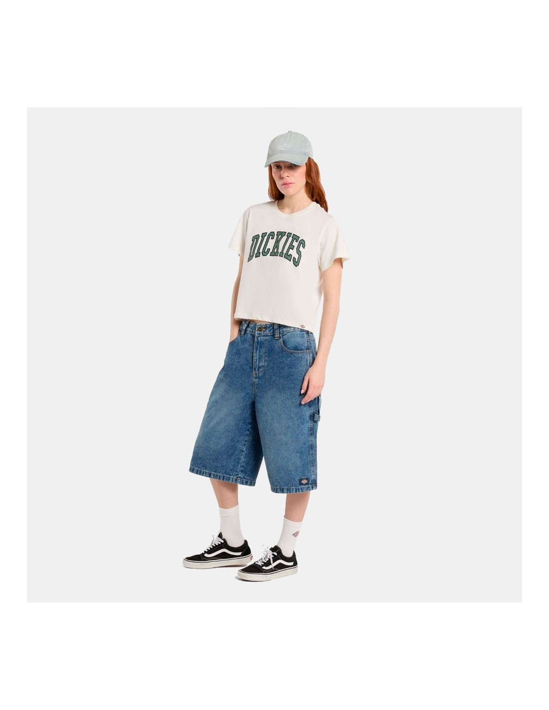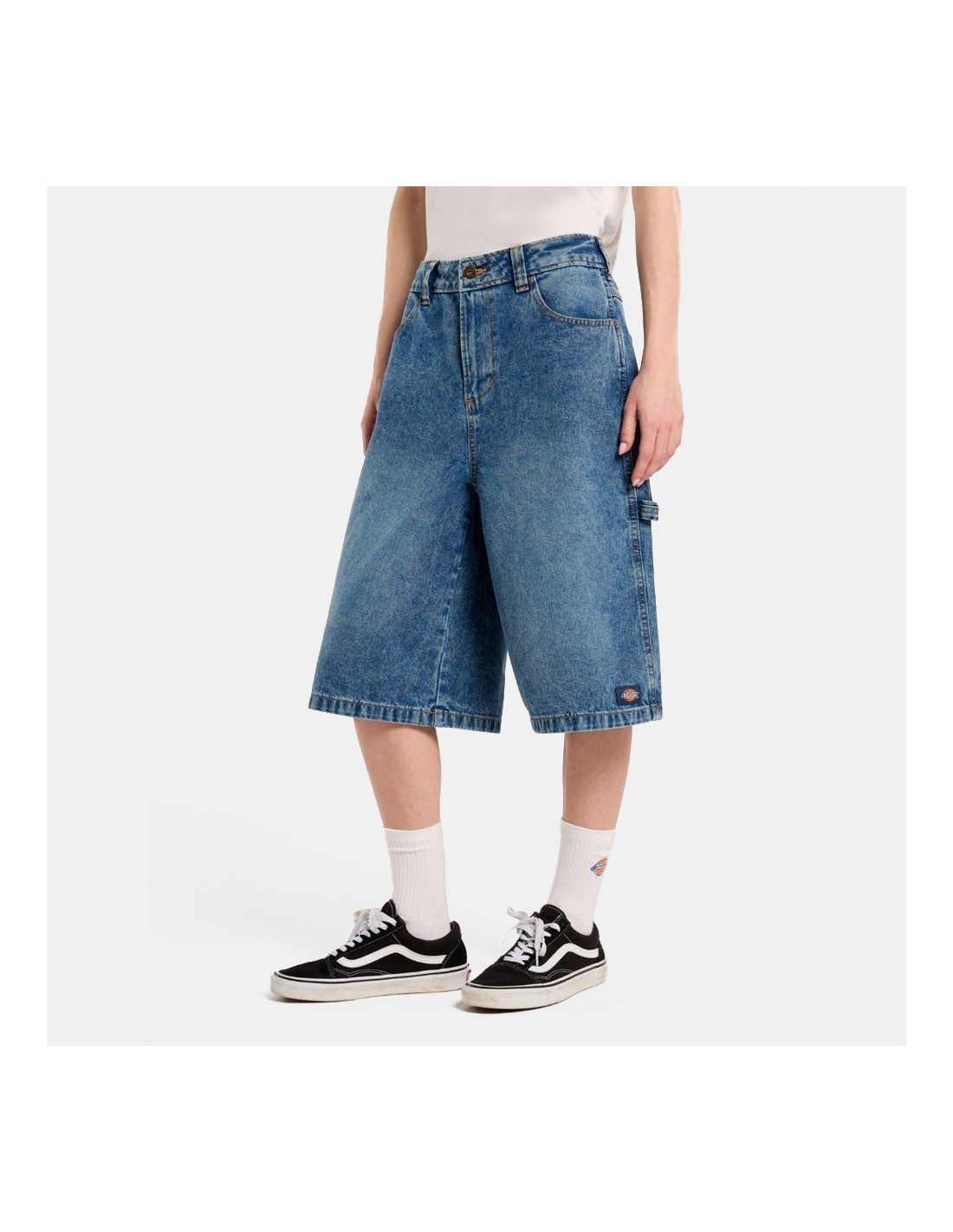 : The Carpenter Denim Jort for women is a new extra length denim short with classic detailing. With cuffs below the knee, these loose fit 13 inch carpenter shorts feature authentic Dickies detailing, two front and two back pockets, as well as side utility pockets. A modernised take on a classic construction.Materials: 100% COTTON.