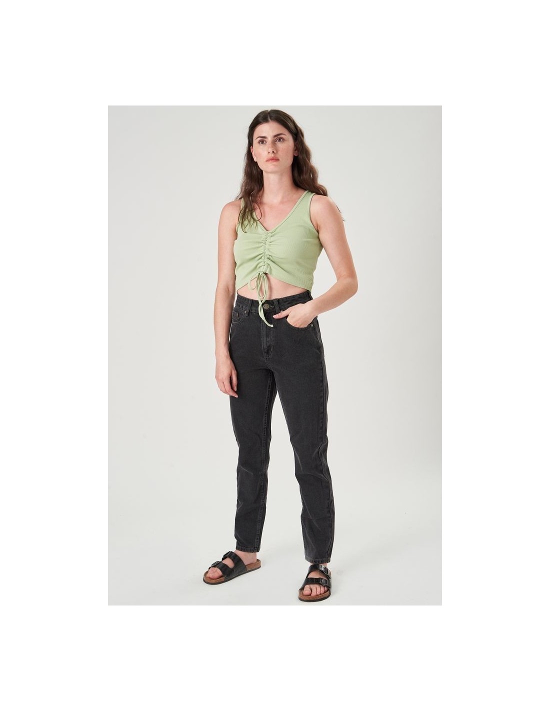 Δροσερό ψηλόμεσο μαμά τζιν με πλυμένες μαύρες τσέπες.