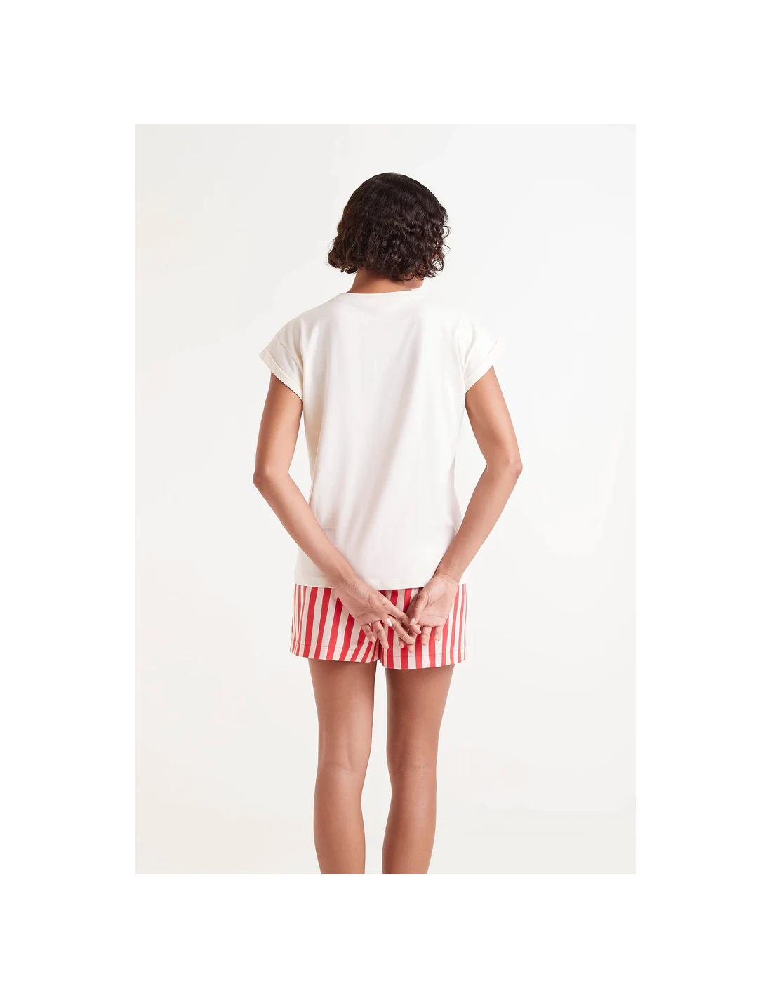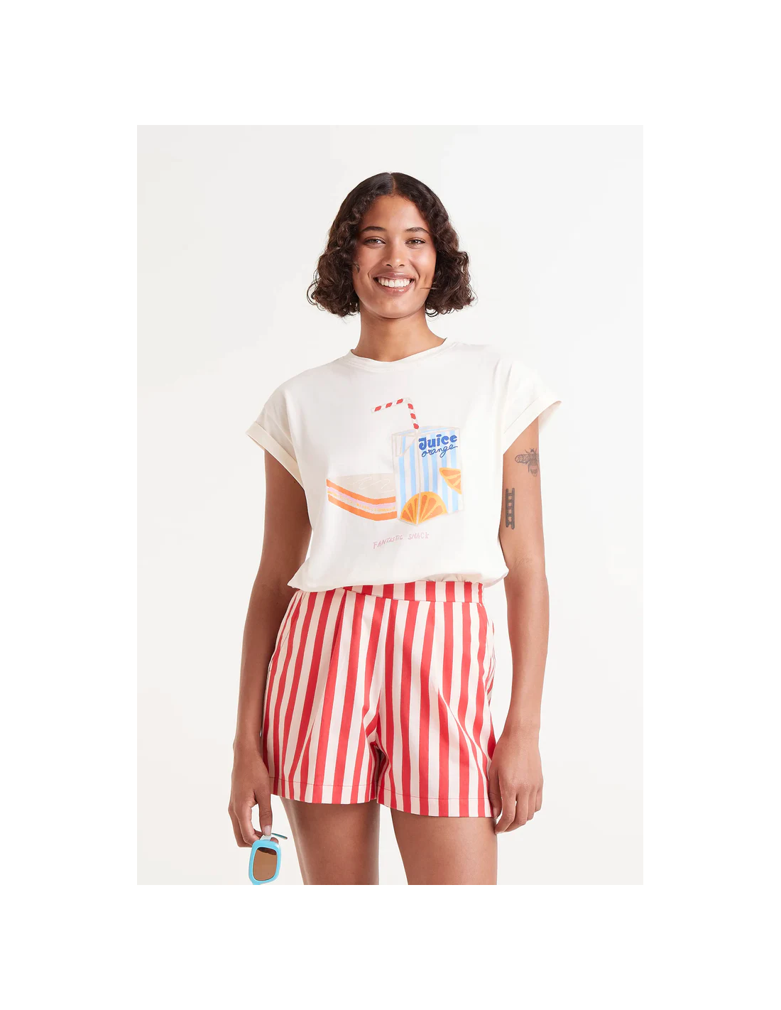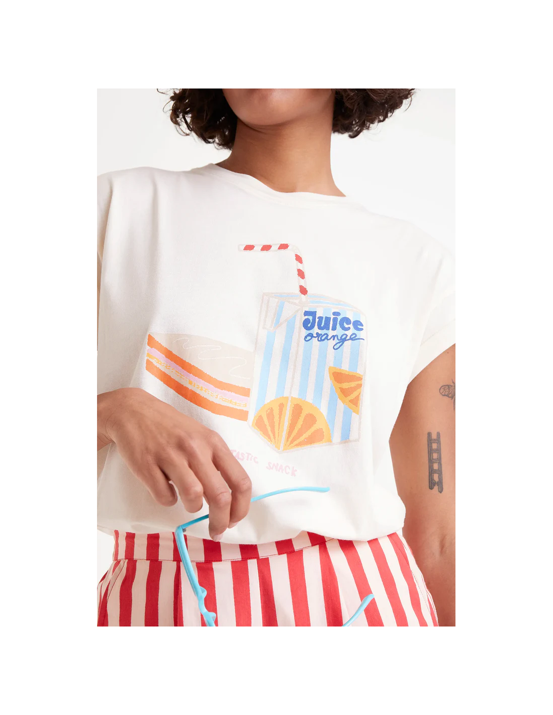 Λευκό κυκλικό πλεκτό μπλουζάκι με στάμπα σνακ. Με στρογγυλή λαιμόκοψη και κοντά μανίκια με μανσέτες.