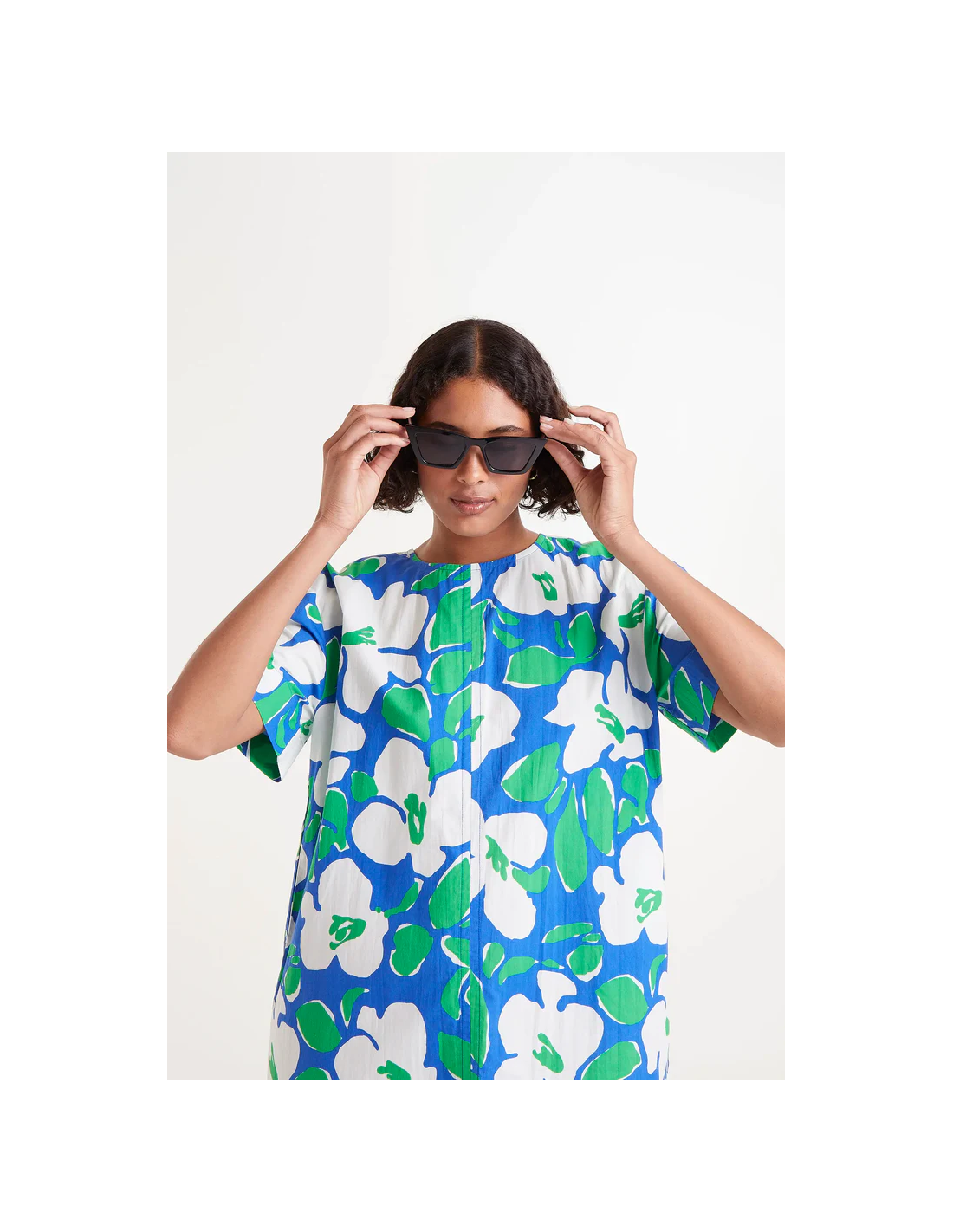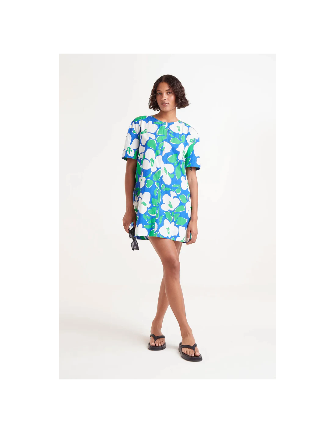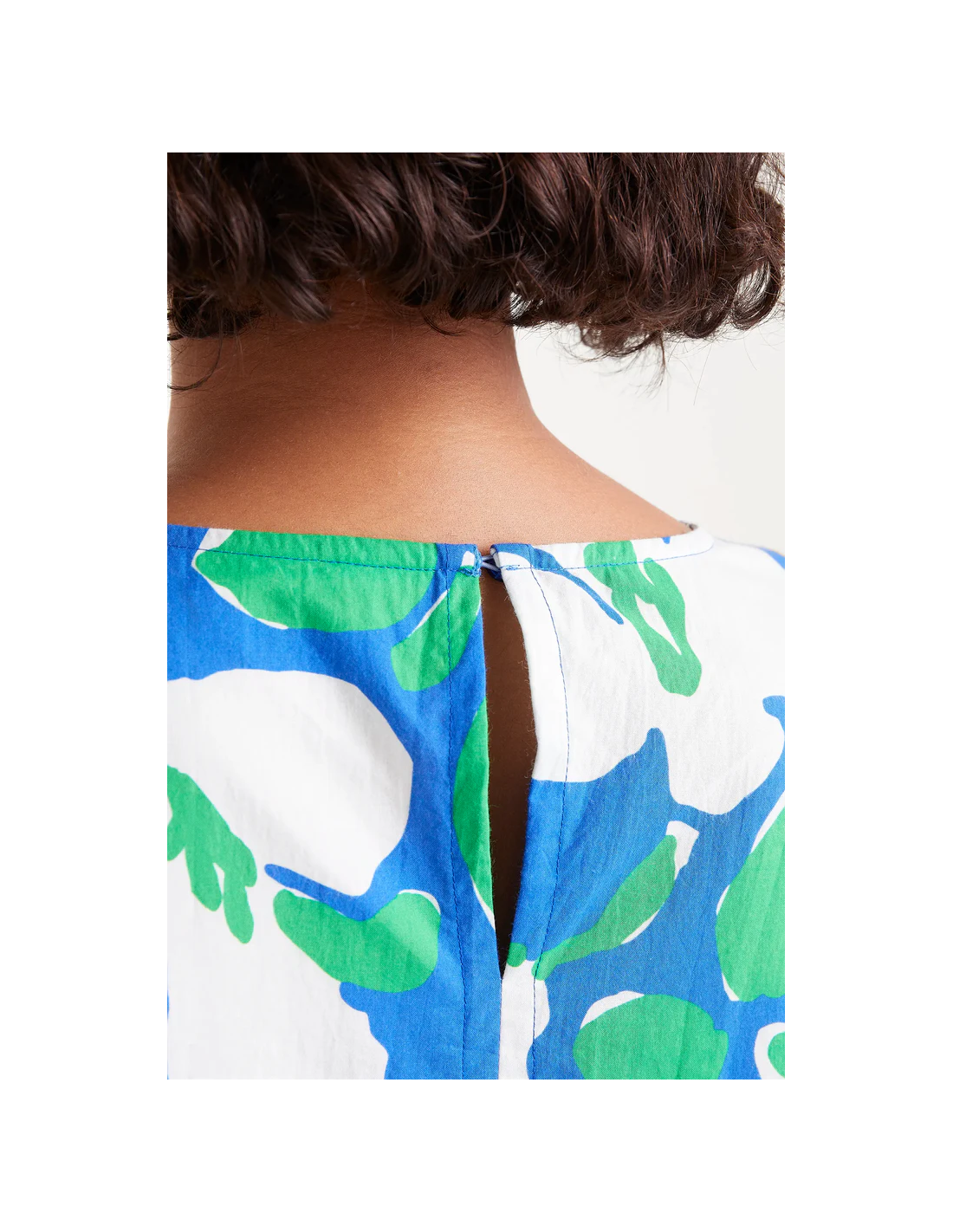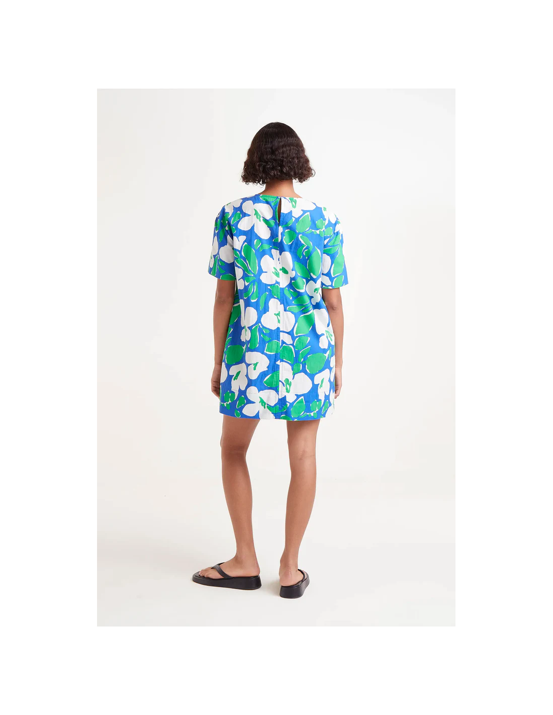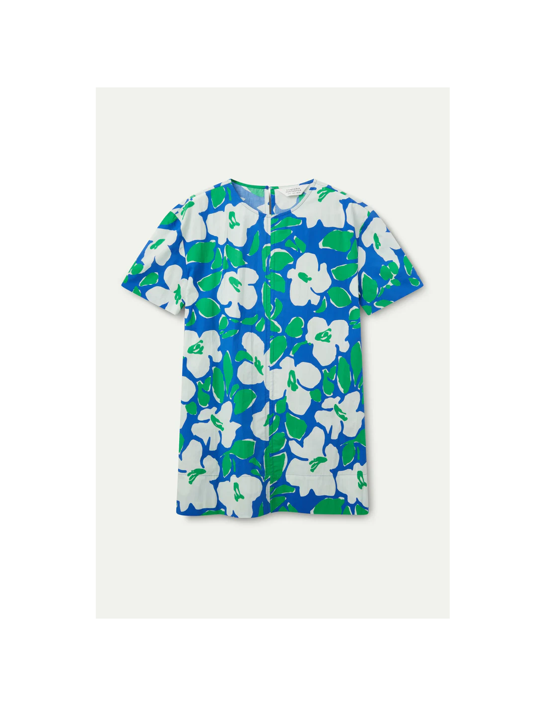 Κοντό φόρεμα από βαμβακερή ποπλίνα με floral print Bosco. Με στρογγυλή λαιμόκοψη και κοντά μανίκια. Κλείσιμο πίσω με σχισμή και κουμπί.